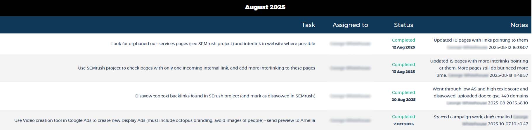 Our SEO Strategy Portal gives you a clear view of all monthly SEO tasks. You can see who each task is assigned to, its status, and the completion date.