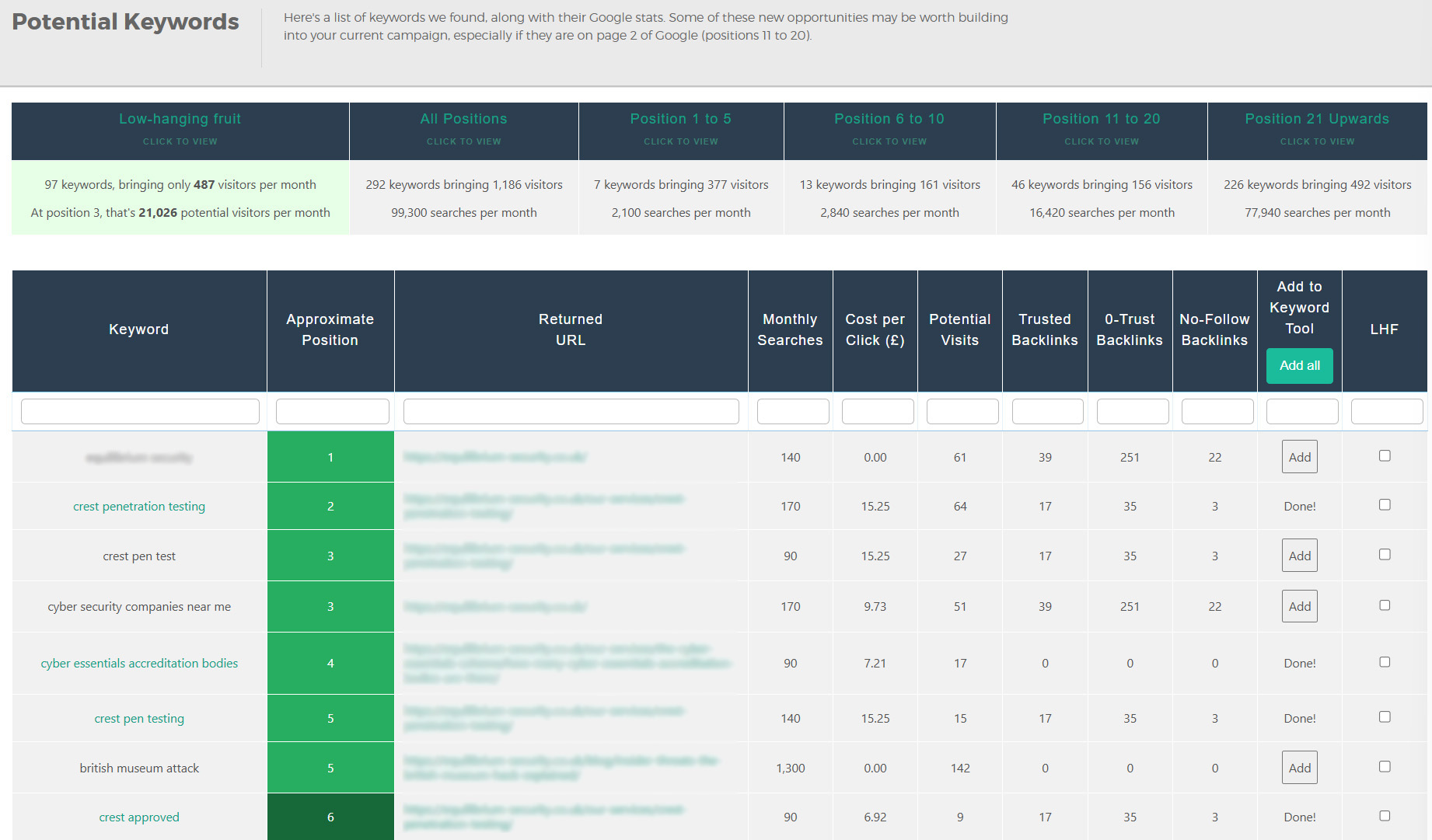 Our portal shows all the keywords your site is currently ranking for, including their Google position, the URL they link to, monthly search volume, and estimated traffic.