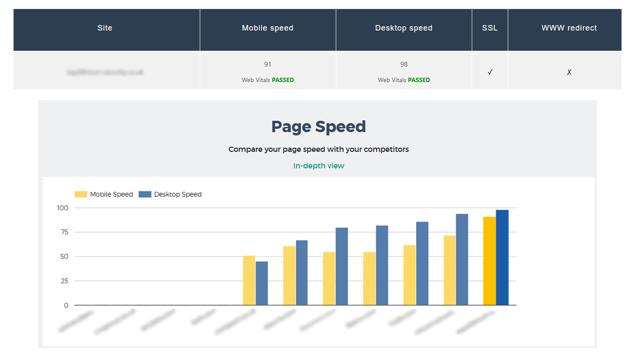Our SEO strategy portal shows your website’s mobile and desktop speed scores out of 100, based on Google PageSpeed Insights.